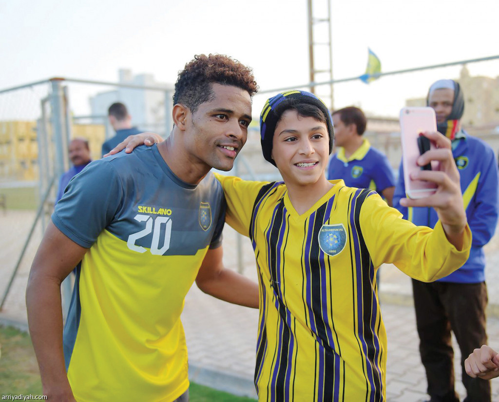 فتح البرتغالي إيمانويل مدرب فريق التعاون الأول لكرة القدم ملف المواجهة المرتقبة أمام الاتفاق في الجولة الـ 22 من دوري كأس محمد بن سلمان للمحترفين في التدريبات التي احتضنها ملعب مقر النادي في بريدة حيث فرض عليهم التدريب من لمسة واحدة واللعب السريع.. ويظهر في الصورة التي التقطت أمس مشجع يأخذ سيلفي بهاتفه المحمول مع الرأس الأخضري هيلتون لاعب التعاون بعد نهاية التدريب (المركز الإعلامي ـ التعاون)