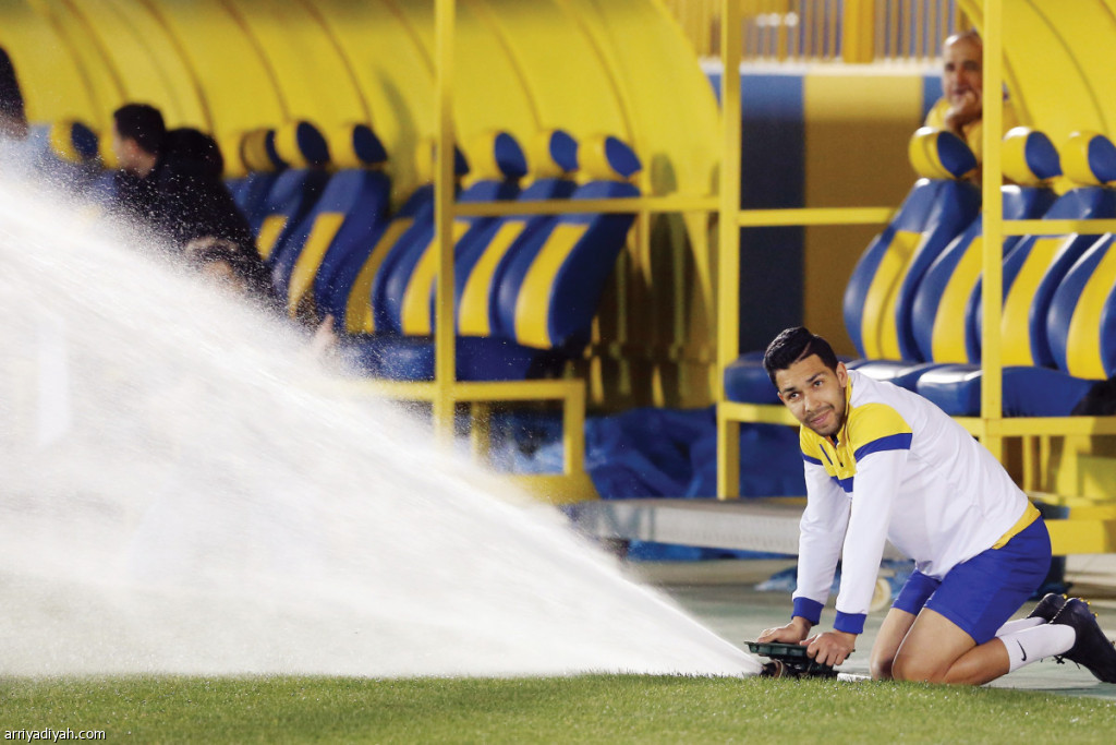 صورة التقطت أمس للبرازيلي بيتروس أراوخو محور فريق النصر الأول لكرة القدم يمسك برشاش الماء خلال مشاركته في حصة فريقه التدريبية الأخيرة استعداداً لمواجهة الشباب اليوم على ملعب الملك فهد الدولي في الرياض في قمة الجولة الـ 22 من دوري كأس محمد بن سلمان للمحترفين تصوير: عبد العزيز النومان