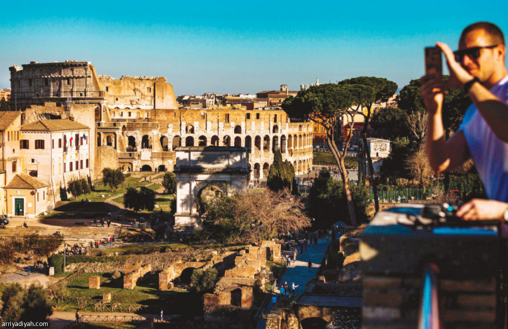 صورة التقطت أمس الأول لسائح يأخذ صورة بجواله من أعلى هضبة بالاتين إحدى الهضاب السبع في روما عاصمة إيطاليا.. ويبدو في الخلف مسرح الكولوسيوم الروماني الشهير (الفرنسية)