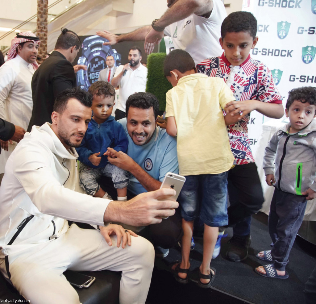 صورة التقطت أمس للسوري عمر السومة يأخذ سيلفي مع جماهير حاصرته أثناء توقيع العقد الأهلاوي مع شركة كاسيو اليابانية تصوير: عبد الله الفالح