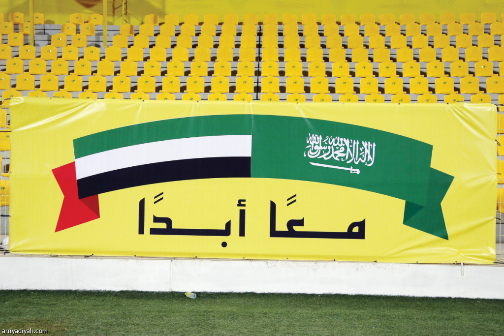 كذلك وُضِعَت عبارات ترحيبية بالنصر، ولوحة في منتصف الملعب تجمع العلمين الإماراتي والسعودي، وكُتِبَ عليها "معًا للأبد"، ما يعكس عمق العلاقة بين البلدين.