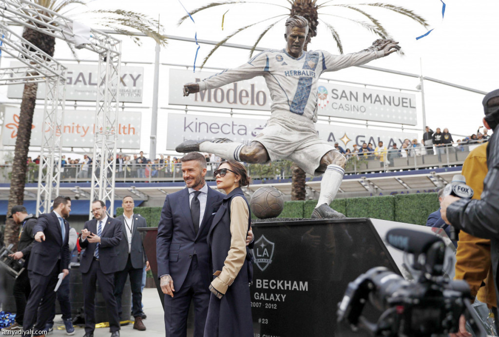 صورة التقطت أمس لديفيد بيكهام قائد المنتخب الإنجليزي السابق وفيكتوريا بيكهام زوجته أمام تمثال للاعب المعتزل مقدّم من نادي لوس آنجليس جالاكسي الأمريكي فريقه السابق تكريماً له بعد مساهمته في زيادة انتشار اللعبة في الولايات المتحدة (الفرنسية)