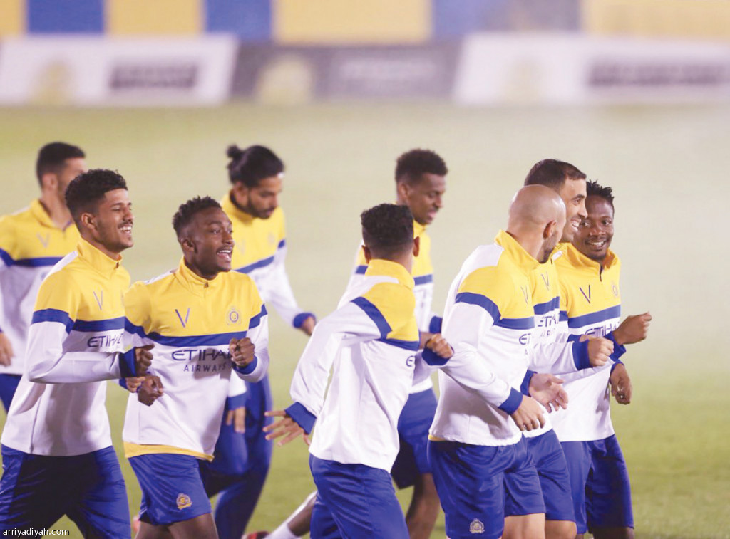صورة التقطت أمس للاعبي فريق النصر الأول لكرة القدم خلال التدريب استعداداً لمباراة الاتفاق (المركز الإعلامي ـ النصر)