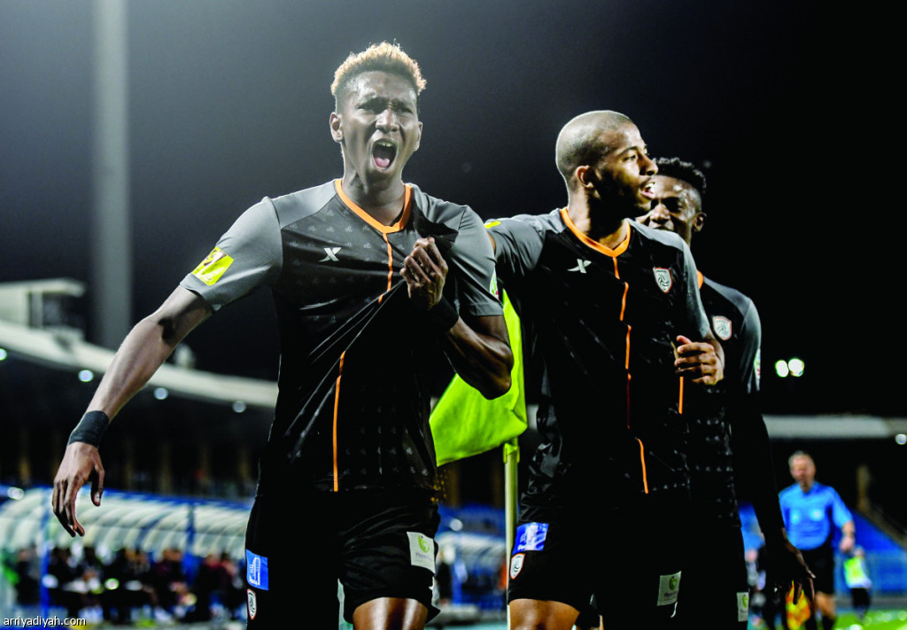 صورة التقطت أمس للغامبي أبو بكر تراولي يحتفل بهدفه في الفيصلي والأول له مع الشباب ويظهر زميلاه سيبا وحسن معاذ تصوير: عبد الرحمن السالم