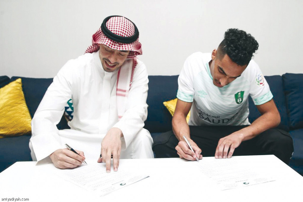 جدد النادي الأهلي عقد علي الأسمري لاعب خط الوسط لـ 4 مواسم.. وفي الصورة التي التقطت أمس عبد الله بترجي رئيس النادي يوقع مع اللاعب العقد الجديد في جدة(المركز الإعلامي ـ الأهلي)