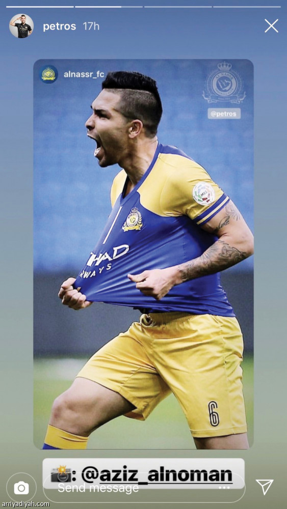احتفل البرازيلي بتروس، لاعب فريق النصر الأول لكرة القدم، عبر حسابه الرسمي في إنستجرام بفوز فريقه أمس الأول أمام الاتفاق بثلاثة أهداف مقابل هدفين، وبث البرازيلي صورة له وهو يحتفل بهدف حمد الله الثالث في الوقت القاتل، وشهد البوست انتشاراً واسعاً في منصات التواصل الاجتماعي بين الجماهير النصراوية.
