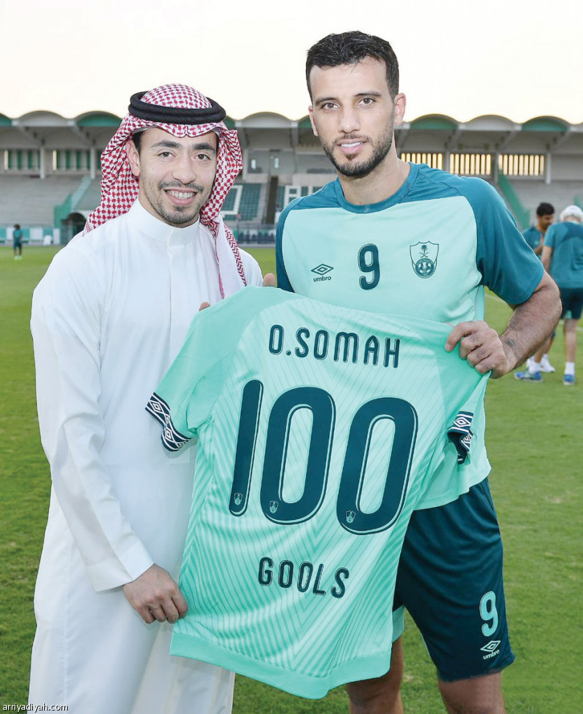 احتفت إدارة الأهلي وأجهزة ولاعبو الفريق الأول لكرة القدم بعمر السومة مهاجم الفريق بمناسبة وصوله إلى الهدف رقم 100.. فيما يعمل الجهاز الطبي على تجهيز محمد العويس حارس المرمى قبل مباراة الهلال.. وفي الصورة التي التقطت أمس عمر السومة وعبد الله بترجي يحملان قميصاً حمل اسم السومة و100 هدف (المركز الإعلامي ـ الأهلي)