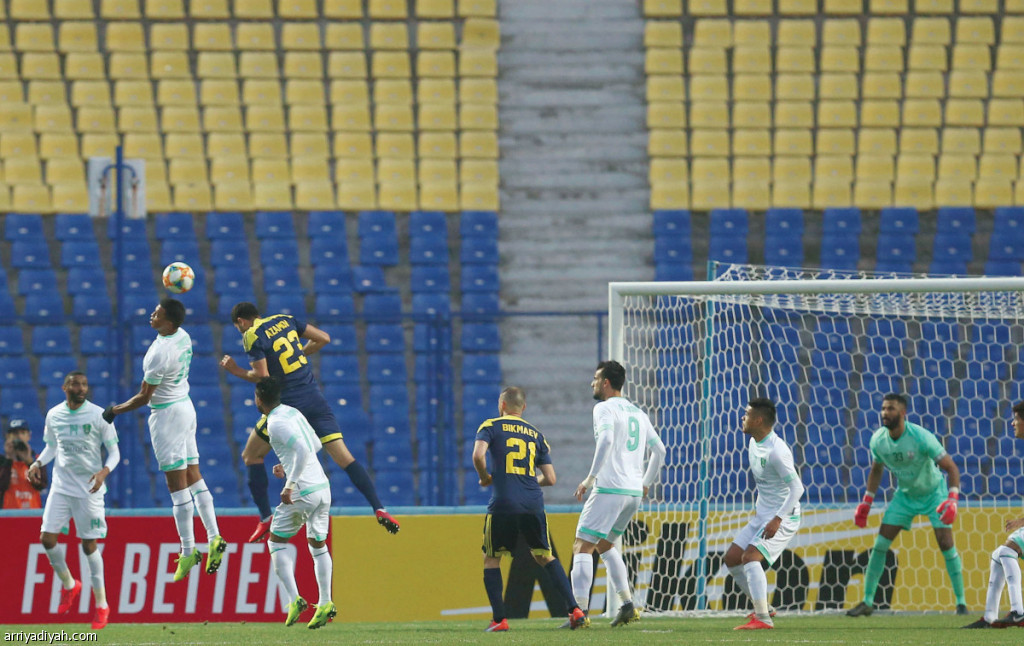 صورة التقطت أمس للرأس الأخضري دجانيني يبعد الكرة برأسه قبل أن تصل إلى مهاجم باختاكور