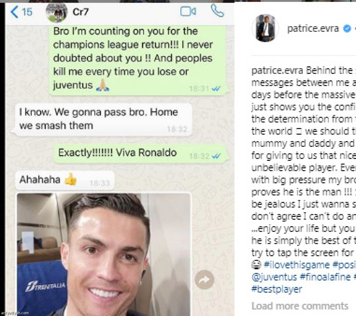نشر الفرنسي باتريس إيفرا، اللاعب السابق لمانشسر سيتي ويوفنتوس والمنتخب الفرنسي، أمس، نص محادثة على “إنستجرام” مع كريستيانو رونالدو، مهاجم فريق يوفنتوس، قبل 5 أيام من لقاء الإياب أمام أتلتيكو مدريد في ثمن نهائي دوري أبطال أوروبا.