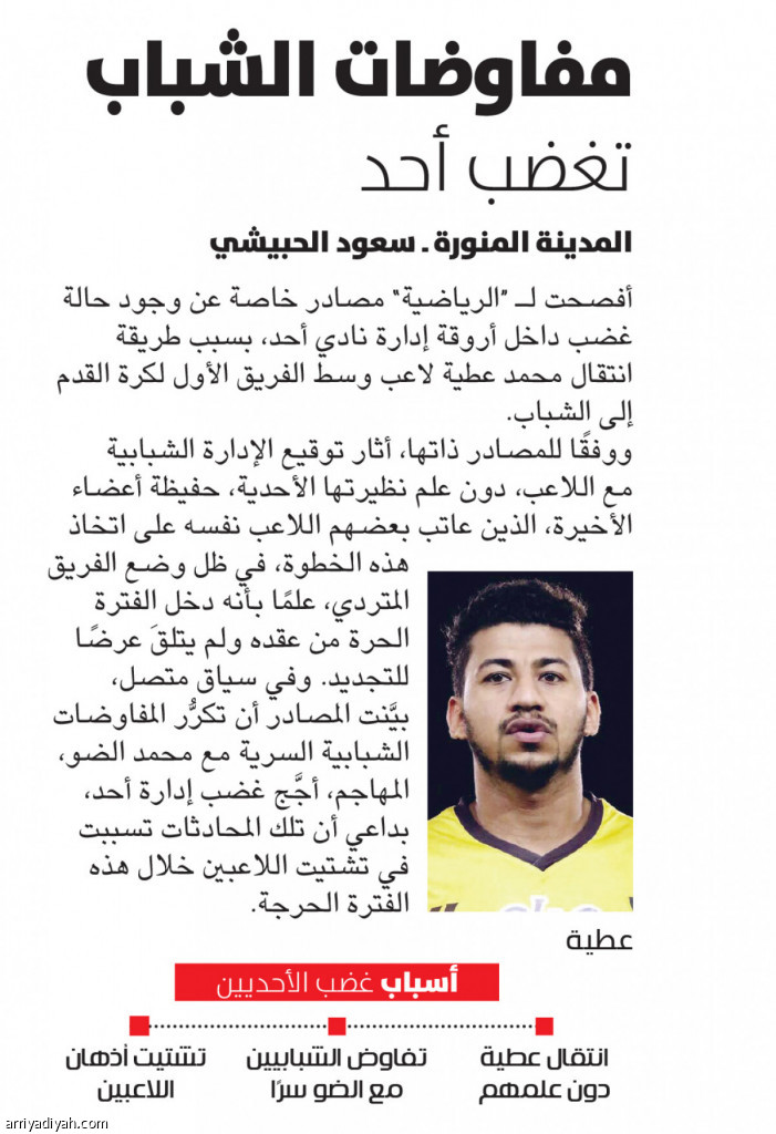 وكانت مصادر رسمية، داخل إدارة أحد برئاسة سعود الحربي، أبدت، أخيراً، غضبها من تعاقد النادي العاصمي مع محمد عطية، لاعب الوسط, حراً دون علمها، ومحاولته ضم محمد الضو، المهاجم الذي دخل إلى الفترة الحرة، مما شتت، حسب قولها، انتباه الفريق، الذي يصارع للبقاء في دوري المحترفين.