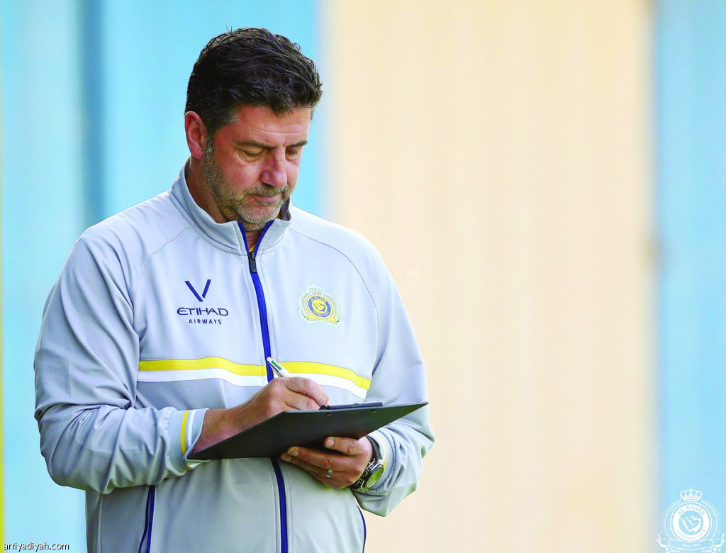 صورة التقطت أمس للبرتغالي فيتوريا مدرب النصر يدوِّن ملاحظاته قبل بدء الحصة التدريبية (المركز الإعلامي ـ النصر)