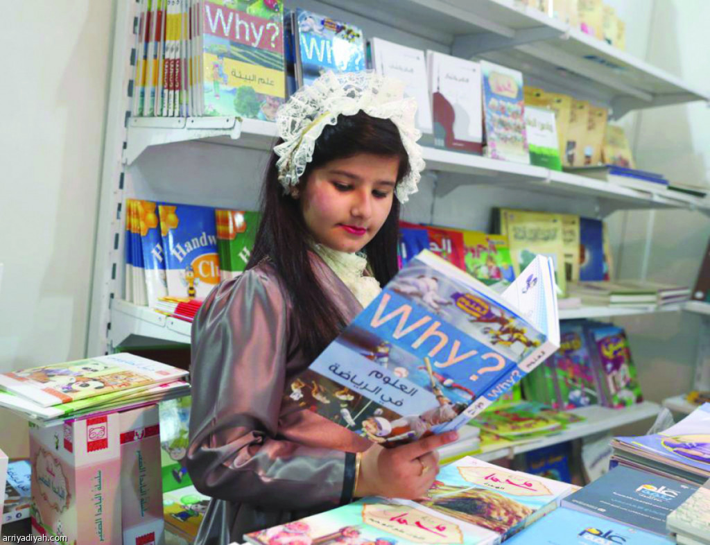 طفلة تقرأ في أحد الكتب المعروضة في جناح معرض الكتاب