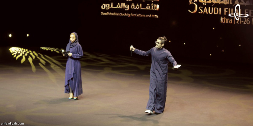 صورة التقطت أمس الأول لمقدمي حفل افتتاح مهرجان أفلام السعودية في الدمام (المركز الإعلامي ـ إثراء)