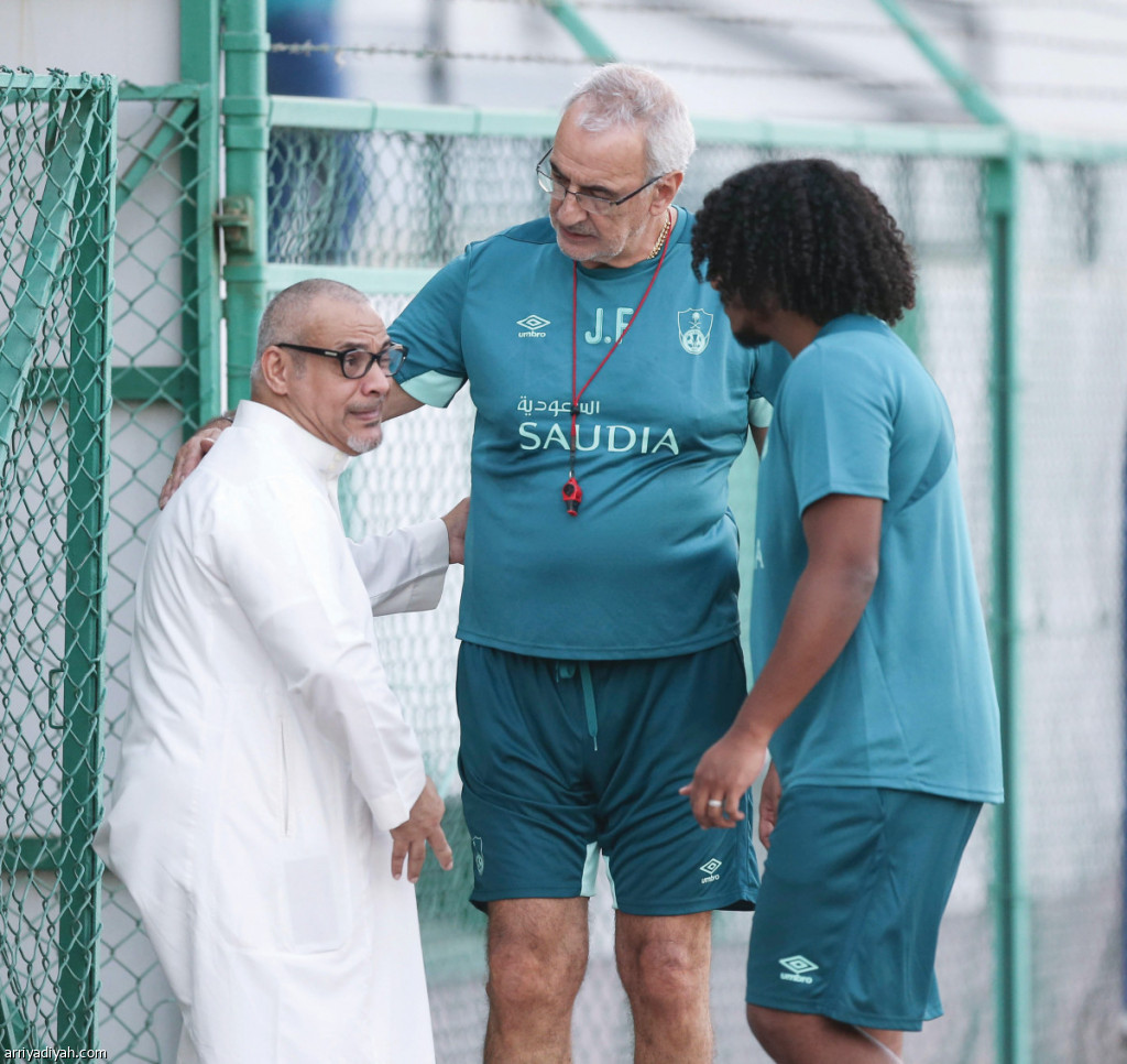 اعتاد حسين الريو المشجع الأهلاوي من ذوي الاحتياجات الخاصة الحضور إلى النادي يومياً، برفقة سائقه الخاص، لمتابعة أحوال وتدريبات الفريق، الأمر الذي جعله يبني علاقات وطيدة مع لاعبي الفريق وجهازهم الفني.. وفي الصور التي التقطت أمس يبدو الديو يتحدث إلى الأوروجوياني فوساتي مدرب الفريق بحضور مشاري الغامدي المترجم قبل بداية التدريبات، وهو أمر أصبح يتكرر يومياً ويأتي أحياناً بمبادرة من المدرب تصوير: وهبان خبتي