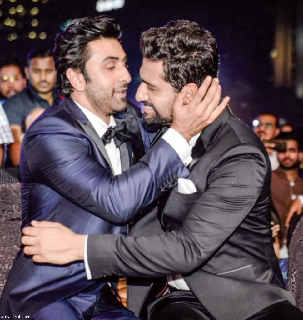 صورة التقطت أمس لرانبير كابور وفيكي كاوشال الممثلين الهنديين خلال حفل توزيع جوائز "فيلم فير" (المركز الإعلامي ـ فيلم فير)