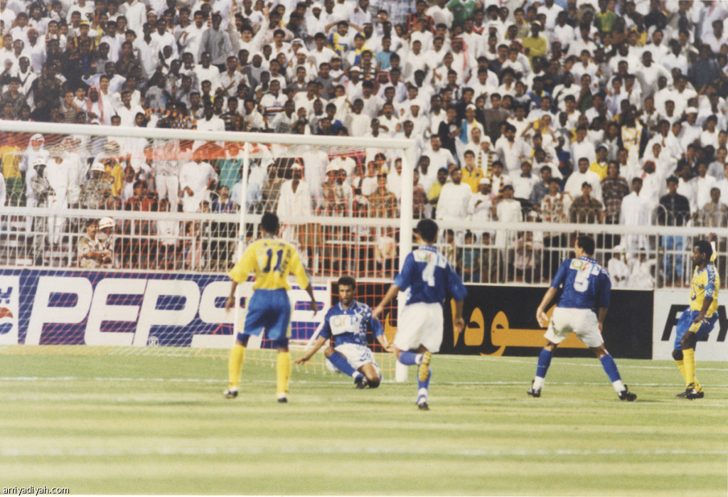 صورة التقطت لماجد عبد الله لاعب النصر السابق لحظة تسجيله هدفه في مرمى الهلال خلال مباراة الديربي بين الفريقين في الدوري موسم 1994-1995 (أرشيفية)