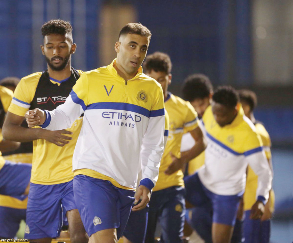 صورة التقطت أمس للمغربي عبد الرزاق حمد الله يجري تمارين لياقية.. ويظهر خلفه فراس البريكان (المركز الإعلامي ـ النصر)