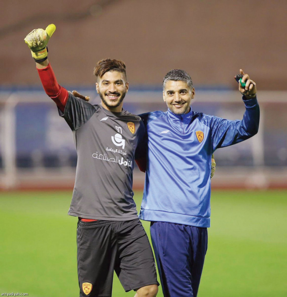 صورة التقطت أمس لعماد فدعق حارس القادسية مع حافظ حمزاوي مساعد المدرب يلوِّحان بأيديهما للجماهير عقب نهاية التدريب (المركز الإعلامي ـ القادسية)