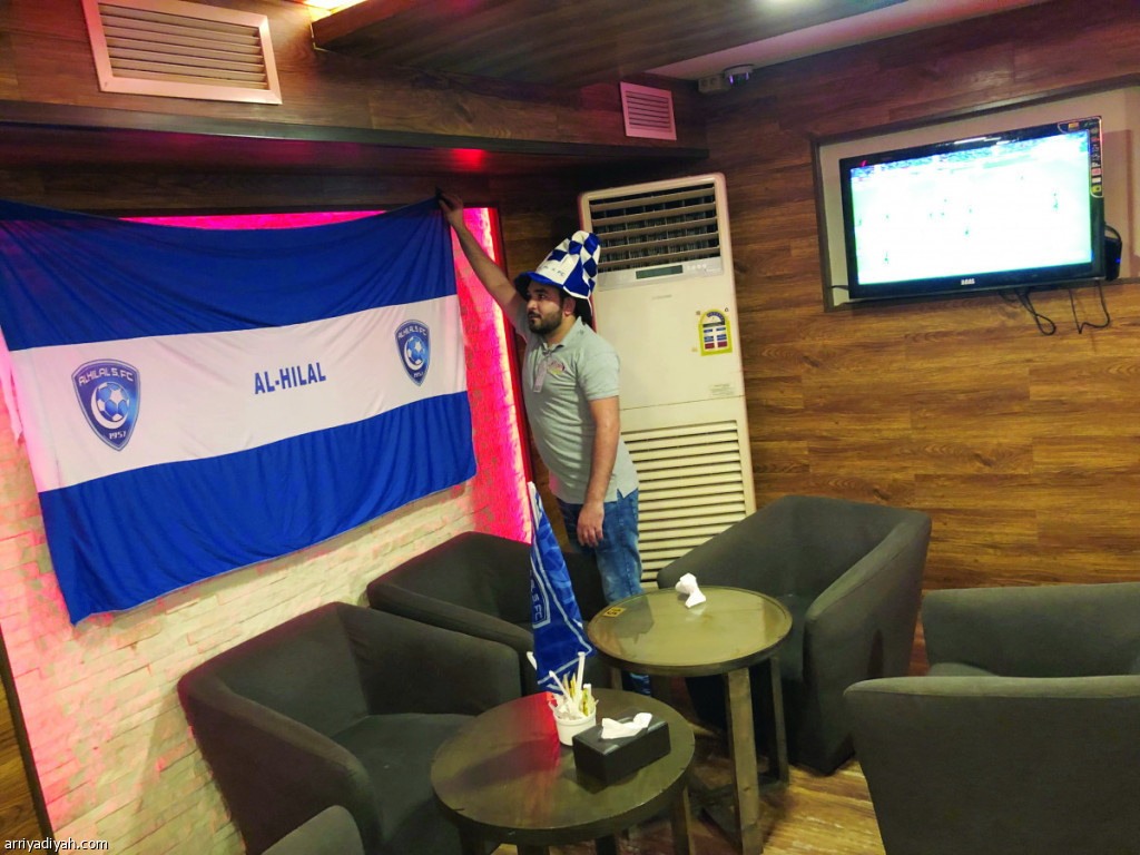 ألقى ديربي النصر والهلال في قمة الجولة 25 من دوري كأس محمد بن سلمان للمحترفين بظلاله على كل الأماكن في جميع أنحاء المملكة العربية السعودية.. وفي الصورة التي التقطت أمس أحد العاملين في أحد المقاهي "شمال جدة" يعلق شعار الهلال في محله استعدادًا لاستقبال الزبائن مساء اليوم تصوير: ماجد هود