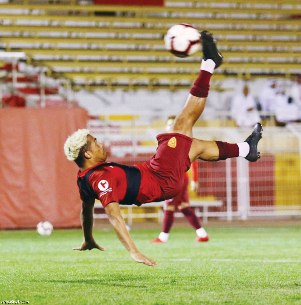 صورة التقطت أمس للبرازيلي بيسمارك مهاجم القادسية الأول لكرة القدم يستعرض مهارته بحركة مقصية أثناء التدريبات التي فرضها السعودي بندر باصريح مدرب الفريق (المركز الإعلامي ـ القادسية)