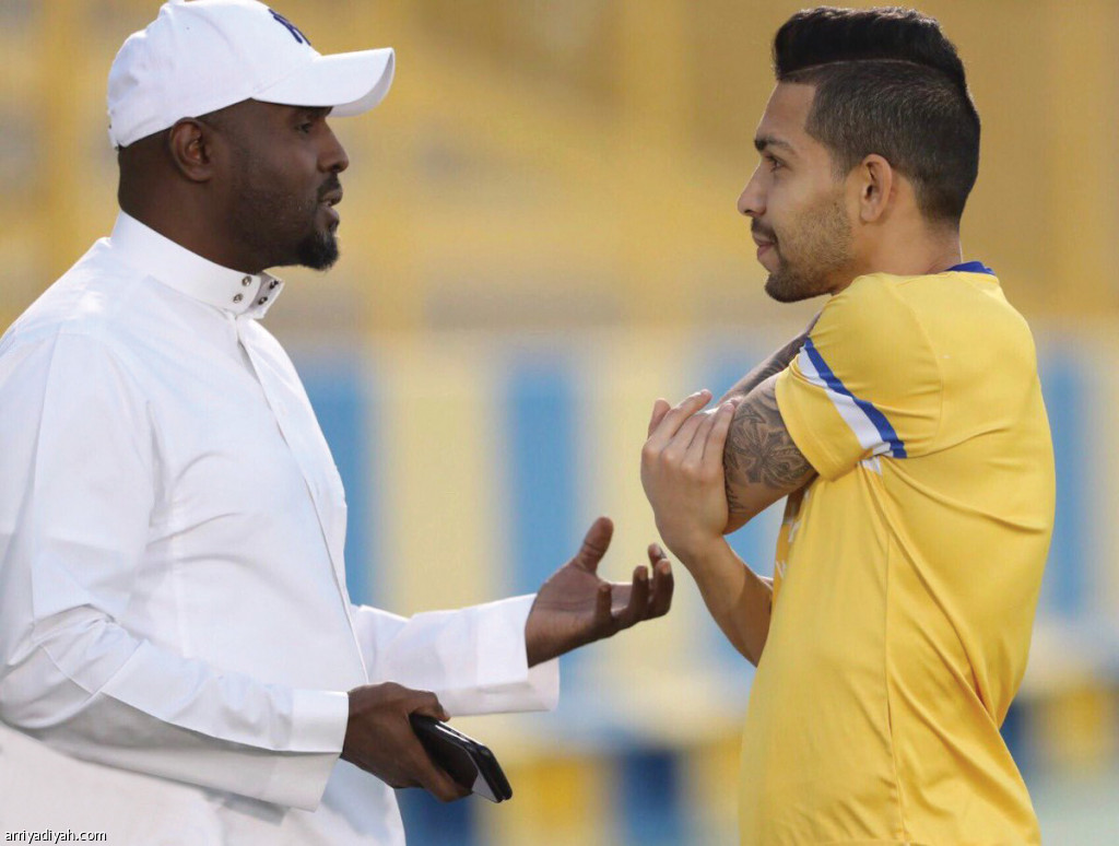 صورة التقطت أمس لمحسن الحارثي مدير الكرة في فريق النصر الأول لكرة القدم في حديث مع البرازيلي بيتروس لاعب الوسط قبل بدء التدريبات استعدادًا للقاء الرائد في الجولة 26 من دوري كأس محمد بن سلمان للمحترفين (المركز الإعلامي ـ النصر)