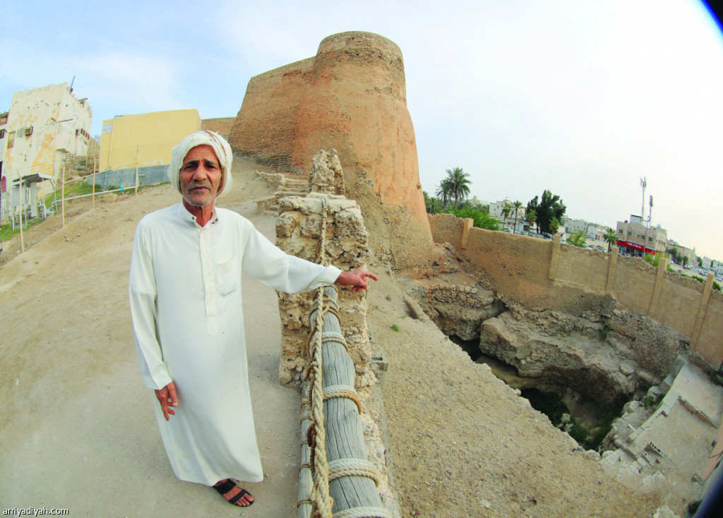 صورة التقطت لأبي علي المسن الذي يزور قلعة تاروت أسبوعيًّا لاسترجاع ماضيه.. وتظهر أمامه عين تاروت التي كانت مصدرًا للماء للأحياء المجاورة تصوير: عيسى الدبيسي