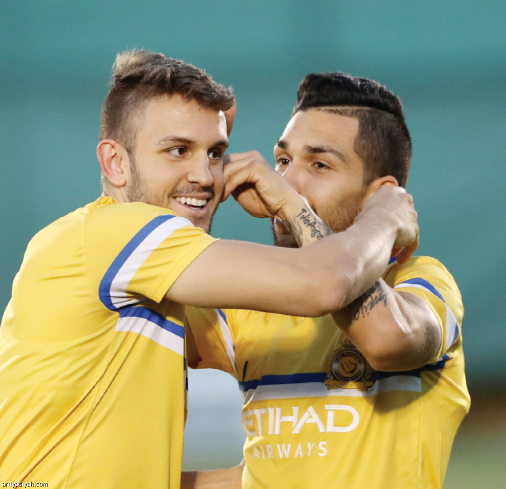 صورة التقطت أمس للبرازيلي بيتروس ومواطنه برونو يخضعان إلى عقاب تمثل في “قرص الأذن” بعد خسارتهما في التحدي الترفيهي الذي جرى على هامش الحصة التدريبية في مقر نادي النصر في مدينة الرياض التي تأتي استعداداً للقاء الزوراء العراقي غداً ضمن منافسات دوري أبطال آسيا تصوير: عبد العزيز النومان