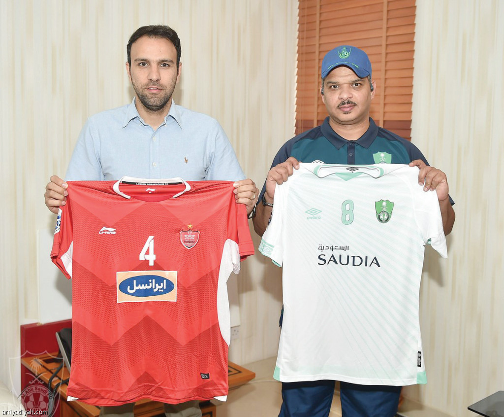 صورة التقطت أمس لمحمد شلية ممثل الأهلي يحمل قميص الفريق بينما يحمل ممثل بيرسبوليس الإيراني قميص ناديه (المركز الإعلامي ـ الأهلي)