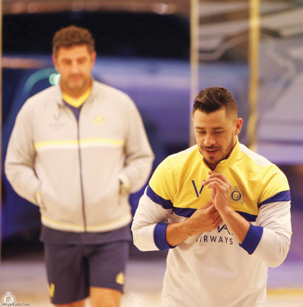 صورة التقطت أمس للبرازيلي جوليانو ثاني أغلى لاعبي الكلاسيكو.. ويظهر خلفه فيتوربا مدرب النصر (المركز الإعلامي ـ النصر)