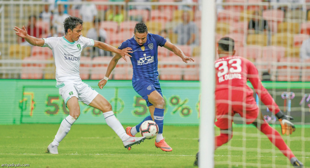 صورة التقطت أمس لسالم الدوسري لاعب الهلال يقود هجمة لفريقه ومحاولة من عبد الله حسون مدافع الأهلي لقطع الكرة ويبدو العويس حارس المرمى تصوير: علي خمج