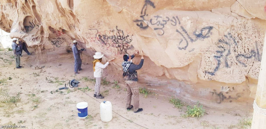 صورة التقطت أمس لخبراء هيئة السياحة يرمِّمون الصخرة (واس)