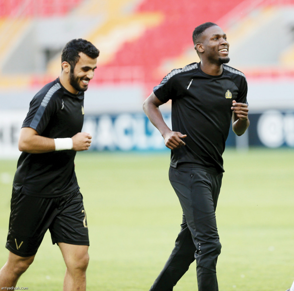 صورة التقطت أمس للثنائي هوساوي والمنصور لاعبَي فريق النصر خلال التدريبات على ملعب كربلاء في العراق تصوير: عبد العزيز النومان