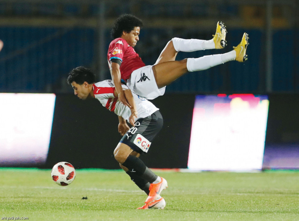 صورة التقطت أمس لمحمد إبراهيم مهاجم فريق الزمالك الأول لكرة القدم يسيطر على الكرة وسط مضايقة من البرازيلي كينو مهاجم براميدز أثناء مباراة الفريقين في الدوري المصري الممتاز لكرة القدم فى المباراة "المؤجلة" بينهما من منافسات الجولة السادسة والعشرين