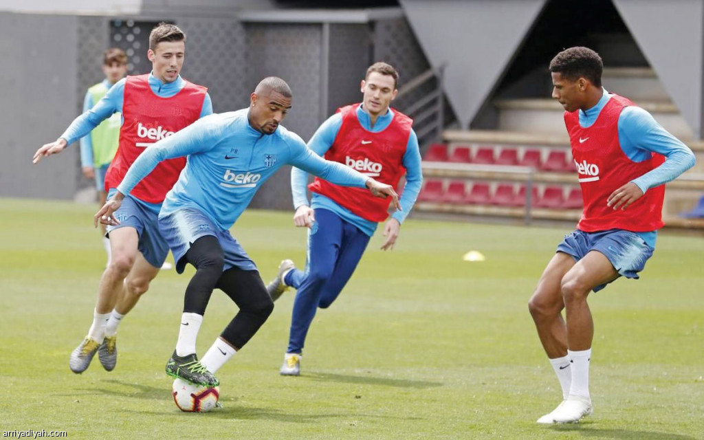 يستعد فريق برشلونة الإسباني لمواجهة نظيره ​ليفانتي​ ضمن الجولة الـ 35 من الليجا على ملعب "كامب نو" ويتطلع البرشا إلى تحقيق الانتصار للتتويج رسميًّا بلقب الدوري الإسباني.. وفي الصورة التي التقطت أمس بواتينج في حوزته الكرة وسط محاصرةٍ من توديبو وفيرمايلين ولينجليت(المركز الإعلامي ـ برشلونة)