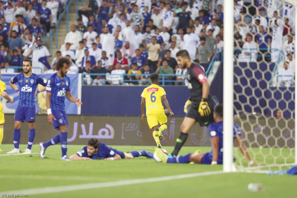 صورة التقطت أمس لريان الموسى لاعب فريق التعاون ينطلق فرحًا بعد تسجيل هيلدون الهدف الثاني.. بينما لاعبو فريق الهلال وعبد الله المعيوف الحارس يندبون حظهم بعد الهدف تصوير: صالح الغنام