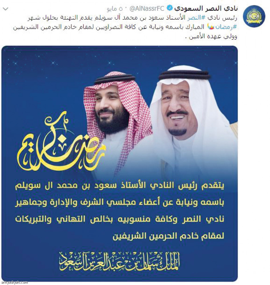 وكان حساب نادي النصر الأبرز في اليومين الماضيين بعد نشر تغريديتن، كانت الأولى تهنئة إلى خادم الحرمين الشريفين الملك سلمان بن عبد العزيز، وإلى الأمير محمد بن سلمان ولي العهد، بقدوم شهر رمضان، والثانية كانت مباركة لكافة النصراويين بالشهر الفضيل، وجمعت التغريدتان نحو 480 ألف متفاعل، يليه حساب نادي الهلال بعد أن لعب مباراة في دوري أبطال آسيا في أول أيام رمضان، ووصل مجموع التفاعلات على تغريداته نحو 400 ألف.