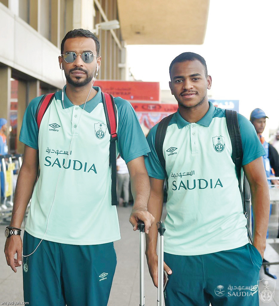 صورة التقطت أمس لهاني الصبياني لاعب الأهلي وإلى جواره خالد عمران مسؤول الملابس قبل المغادرة إلى الرياض (المركز الإعلامي ـ الأهلي)