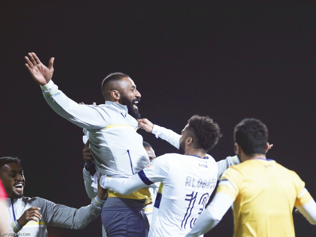 واصل وليد عبد الله حارس مرمى النصر الاحتفال بطريقته التي اشتهر بها في أوساط الجماهير بعد كل هدف يسجله فريقه.. وفي الصورتين اللتين التقطتا أمس يظهر وليد يحتفل مع زملائه اللاعبين بالهدف الأول.. وفي الثانية يحتفي مع المغربي حمد الله بعد نهاية المباراة تصوير: عبد العزيز النومان و(المركز الإعلامي ـ الدوري السعودي)
