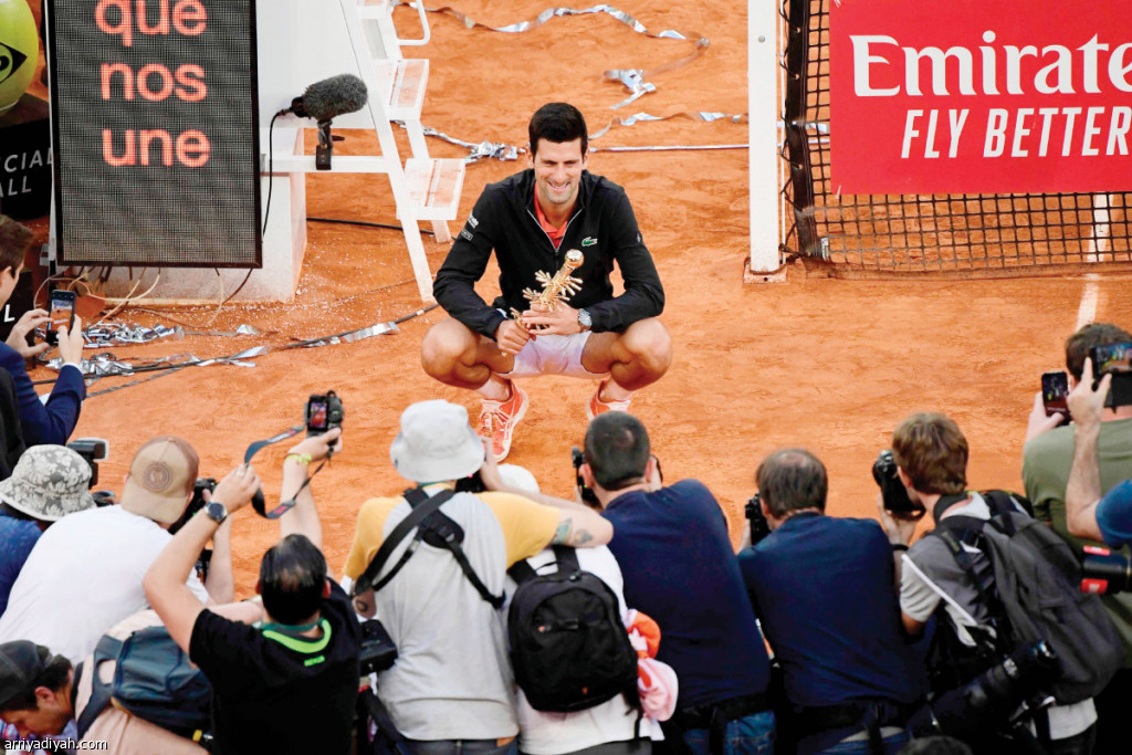 أحرز الصربي نوفاك ديوكوفيتش المصنف الأول على العالم لقب دورة مدريد رابع دورات الماسترز للألف نقطة في كرة التنس بتغلبه أمس في النهائي على ستيفانوس تسيتسيباس اليوناني الشاب بمجموعتين دون رد 6ـ3 و6ـ4.. وفي الصورة التي التقطت أمس يظهر الصربي ديوكوفيتش يلتقط الصور التذكارية مع كأس البطولة (رويترز)
