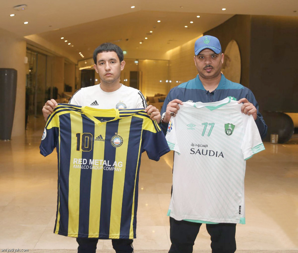 صورة التقطت أمس لمحمد شلية المنسق الإداري يحمل قميص الفريق الذي سيرتديه اللاعبون مساء اليوم وإلى جانبه ممثل فريق باختاكور يحمل قميص فريقه (المركز الإعلامي ـ الأهلي)