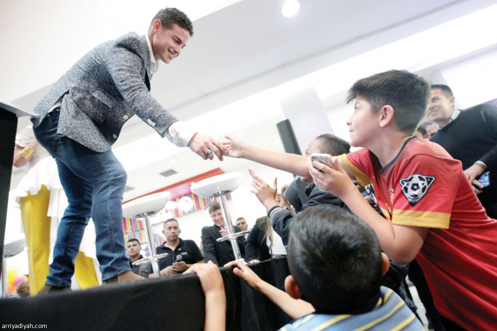 صورة التقطت أمس للكولمبي خاميس رودريجير لاعب فريق بايرن ميونيخ يلتقط الصور مع حشد من الأطفال خلال مشاركته في تقديم لعبة “الأطفال المحاربين” الإلكترونية في بوغوتا العاصمة الكولومبية (رويترز)