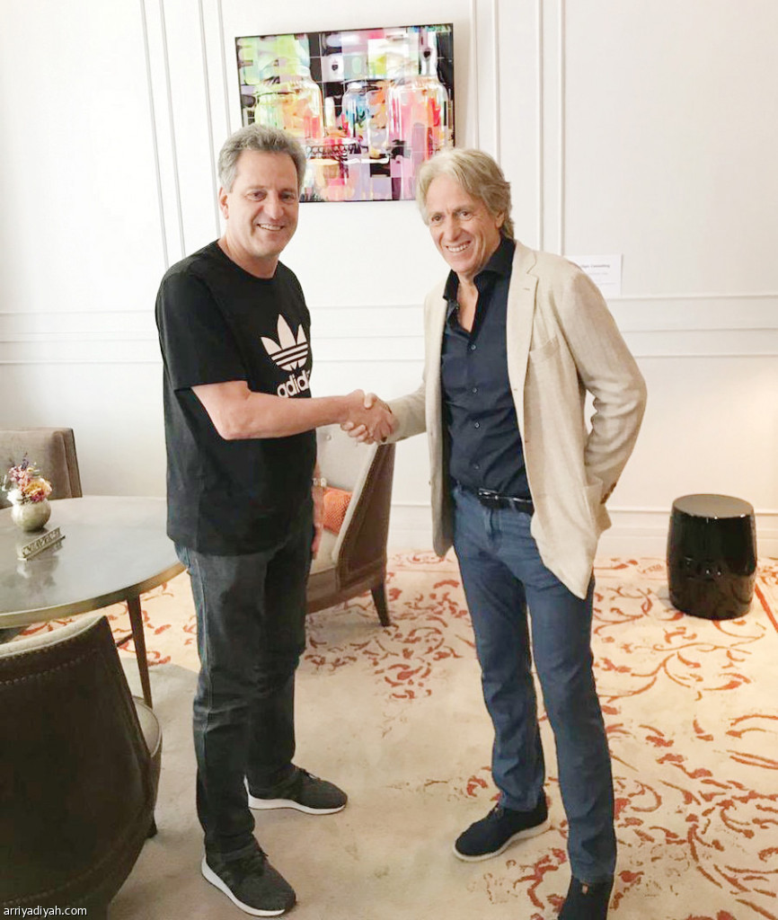 توصل البرتغالي خورخي خيسوتوصل البرتغالي خورخي خيسوس مدرب فريق الهلال الأول لكرة القدم السابق إلى اتفاق مع رودولفو لانديم رئيس نادي فلامنجو البرازيلي للإشراف على الفريق موسمًا واحدًا فيما أعلن النادي قدوم المدرب في منتصف يونيو الجاري من أجل التوقيع رسميًّا.. وفي الصورة التي التقطت أمس يظهر خيسوس ولانديم بعد إبرام الاتفاق(حساب فلامنجو الرسمي في تويتر)س مدرب فريق الهلال الأول لكرة القدم السابق إلى اتفاق مع رودولفو لانديم رئيس نادي فلامنجو البرازيلي للإشراف على الفريق موسمًا واحدًا فيما أعلن النادي قدوم المدرب في منتصف يونيو الجاري من أجل التوقيع رسميًّا.. وفي الصورة التي التقطت أمس يظهر خيسوس ولانديم بعد إبرام الاتفاق(حساب فلامنجو الرسمي في تويتر)