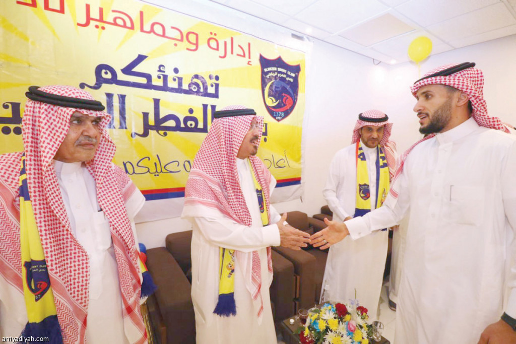 صورة التقطت أمس لخالد البركة الظهير الأيسر المنتقل حديثًا من فريق الحزم إلى الأهلي يصافح فهد المالك رئيس هيئة أعضاء شرف الحزم خلال حفل معايدة نظمه النادي في مقره في محافظة الرس (المركز الإعلامي ـ الحزم)