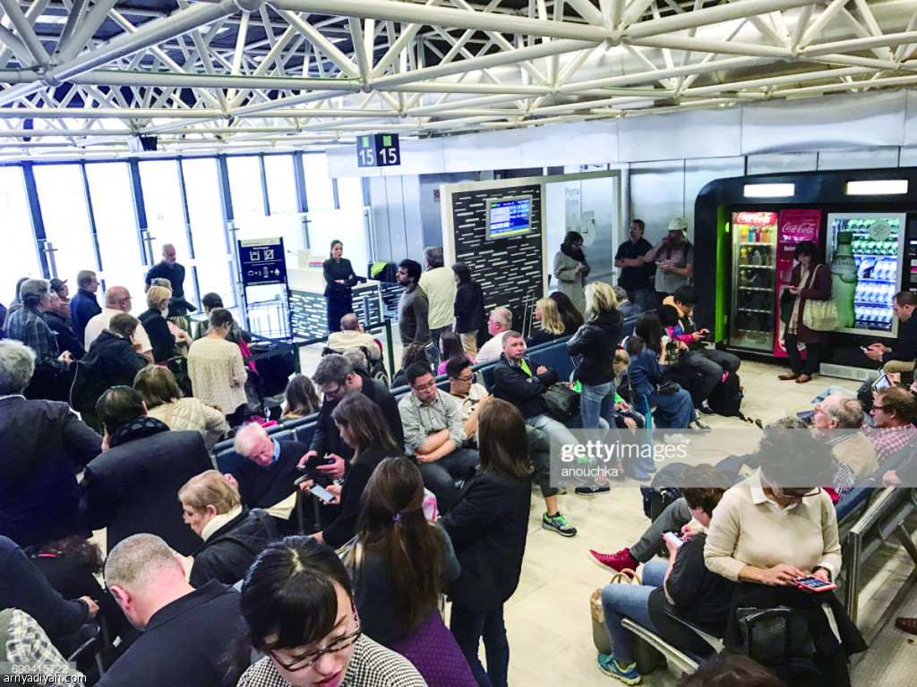 صورة التقطت لمسافرين يقفون عند بوابة مرور في مطار لشبونة الدولي الذي يعود تشغيله إلى عام 1942 (صور جيتي)