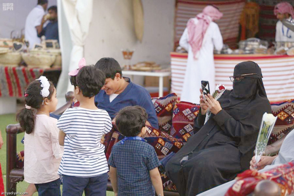 صورة التقطت أمس لإحدى السيدات تصور أطفالها بهاتفها النقال خلال فعاليات الصيف في محافظة المندق (واس)