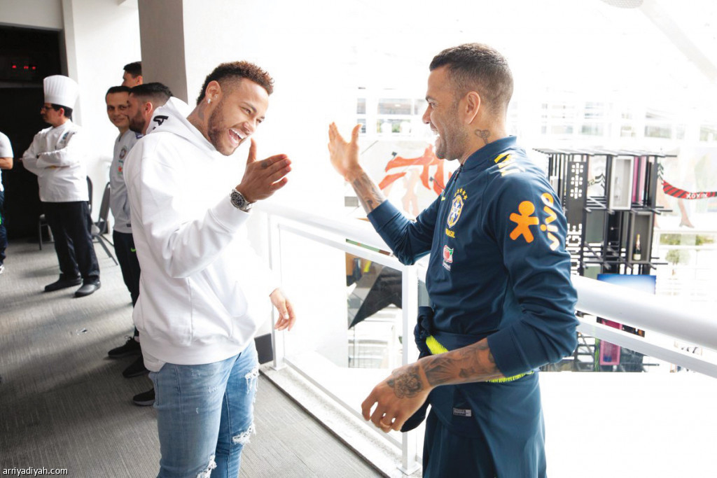 صورة التقطت أمس لداني ألفيس مدافع المنتخب البرازيلي يرحب بنيمار زميله المبعد عن المشاركة في كوبا أمريكا بداعي الإصابة في معسكر المنتخب البرازيلي (الفرنسية)