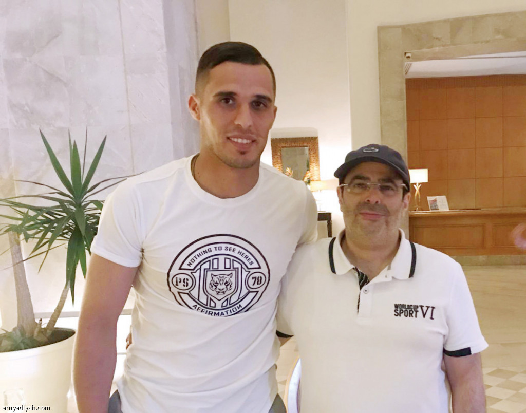 صورة التقطت لعبد الله شويل عضو مجلس إدارة أبها مع الجزائري مصطفى زغبة حارس المرمى خلال جلسة الشهر الماضي في تونس(خاصة بالرياضية)