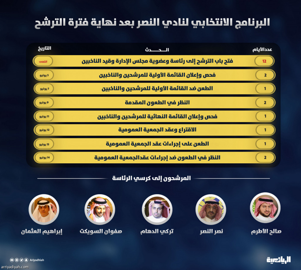 بعد إغلاق فترة الترشح الثالثة لانتخابات رئيس وأعضاء مجلس إدارة نادي النصر، وذلك بعد تمديدها فترة جديدة إثر طلب الأعضاء الذهبيين للنادي، يتبقى للانتهاء من البرنامج الانتخابي للنصر تسع أيام للتعرف على الإدارة الجديدة.