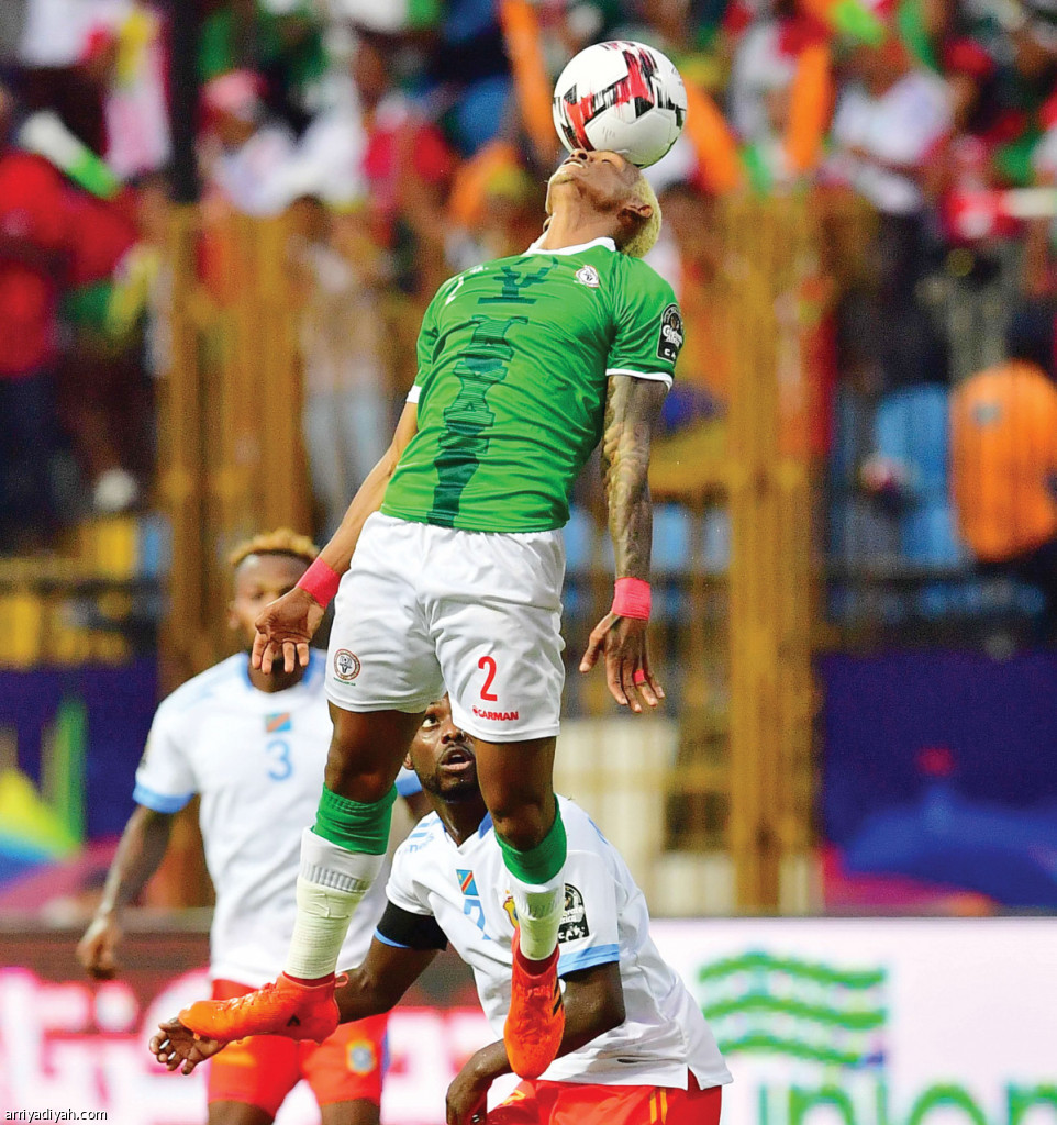 صورة التقطت أمس لكارلوس أندريا مهاجم مدغشقر والعدالة السعودي يرتقي إلى كرة عالية وسط مضايقة مدافعي الكونغو أثناء المباراة التي حسمها الأول بركلات الترجيح في ثمن نهائي كأس أمم إفريقيا (الفرنسية)