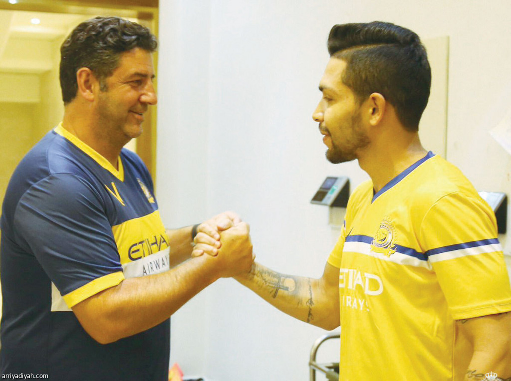 دشن فريق النصر الأول لكرة القدم استعداداته للموسم المقبل وأطلق تدريباته بعد الإجازة الطويلة التي استمتع بها الفريق عقب تحقيقه لقب دوري كأس محمد بن سلمان للمحترفين.. وفي الصورة التي التقطت أمس البرتغالي روي فيتوريا مدرب الفريق والبرازيلي بيتروس يتبادلان التحية أثناء لقائهما في النادي تصوير: عبد العزيز النومان
